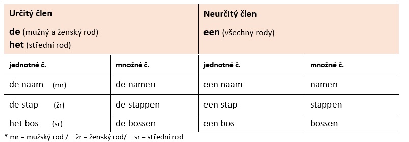 Stejně jako v řadě jiných jazycích, i v nizozemštině máme členy (určité a neurčité). Docela pěkný kompromis mezi němčinou a angličtinou se tu objevuje (v AJ jsou to "the, a, an" a v NJ "der, die, das, ein, eine"). Máme zde pouze dva určité členy a jeden neurčitý člen - "de" pro mužský a ženský rod, "het" pro rod střední a "een" pro všechny rody jako člen neurčitý. V množném čísle je pouze člen "de", a to pro všechny rody. Neurčitý člen v množném čísle není (stejně jako například v angličtině)