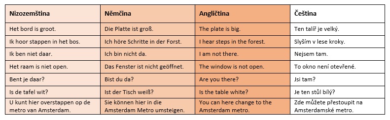 Jen tak pro srovnání jsem vytvořil tabulku, ve které jsem zmíněné příkladové věty přeložil do nizozemštiny, angličtiny a němčiny (s českým překladem), aby bylo vidno, že jsou tyto jazyky podobné. I když se některá slova píší jinak, foneticky jsou si velmi podobná. (zároveň se omlouvám, pokud by měl někdo pochybnosti o překladu - snažil jsem se, aby to bylo správně)